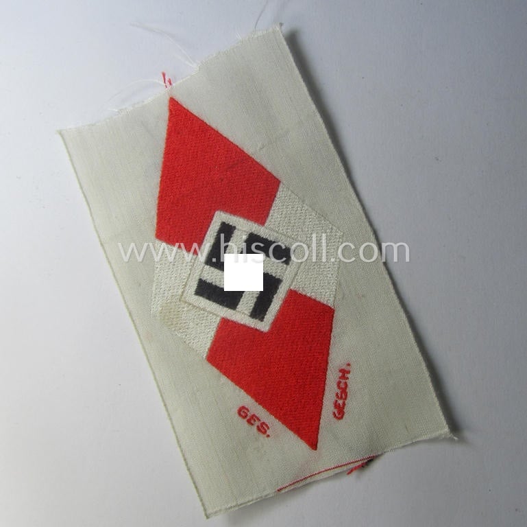 'Standard-issue'-pattern, 'Hitlerjugend'- (ie. 'Bund Deutsche Mädel) ie. HJ/BDM-related so-called: 'Ärmelraute' as executed in so-called 'BeVo'-weave pattern (being a never used- ie. 'virtually mint' example that retains its 'RzM'-etiket)