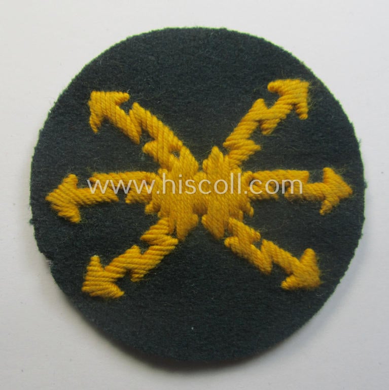 This is a neat example of a WH (Heeres) so-called: trade- and/or special-career arm-insignia (ie. 'Laufbahn- o. Tätigkeitsabzeichen') as was specifically intended for an army: 'Funkmeister' (or: radio-operator ie. radio-equipment NCO) being a neatly hand-embroidered variant as executed on darker-green-coloured wool and that comes in an overall very nice- (I deem simply never worn ie. 'virtually mint'-), condition. The piece is neatly machine-embroidered on a darker-green-coloured- and/or woolen-based background and shows a (detailed and/or hand-embroidered, 'tripple-arrow'-sign as executed in bright-yellow-coloured linnen (as can be seen on the pictures). The patch shows an additional, greyish-blue-toned 'backing' and shows a white-toned, inked makers'-designation-stamp on its back that reads 'G.K.' or alike (as is more often encountered). Simply a nice occasion to acquire an attractive - and simply never used! - WH (Heeres) trade-/specialist-badge for a competitive price!