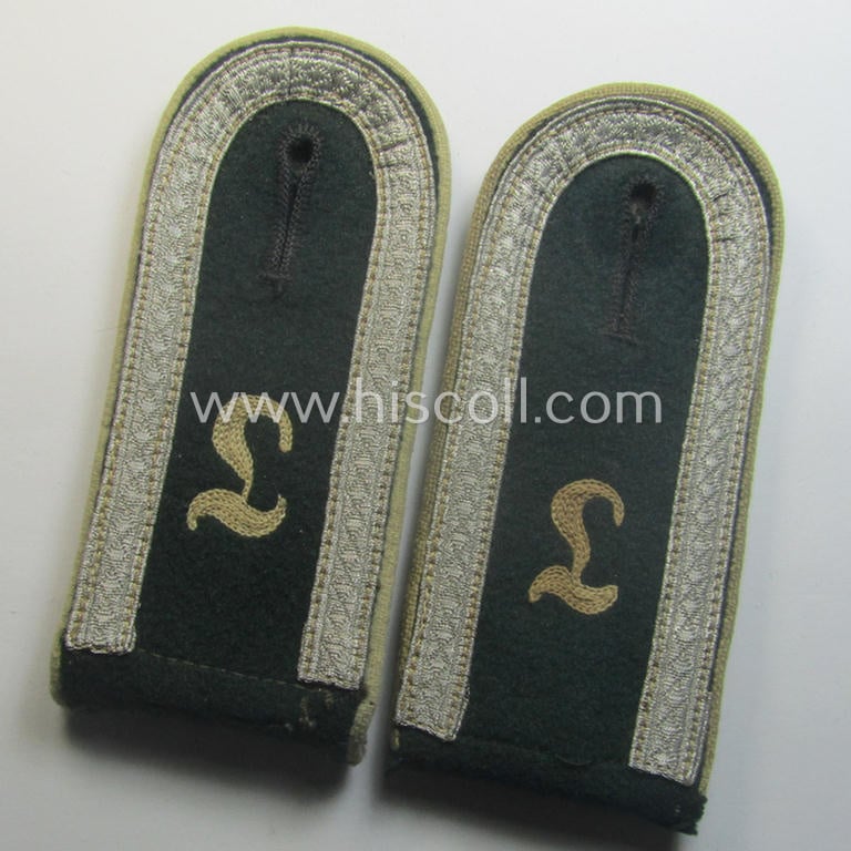 This is an attractive - fully matching, very desirable and actually not that easily found! - pair of WH (Heeres) early- (ie. evt. pre-) war-period, so-called: 'M40'-pattern and neatly 'cyphered' NCO-type shoulderstraps as piped in the white- (ie. 'weisser'-) coloured branchcolour as was specifically intended for - and clearly worn by! - an: 'Unteroffizier einer Infanterie Lehr-Bataillons o. Regiments' (or: NCO ie. junior-sergeant who served within an army-infantry training ie. instruction battalion or regiment) and that comes in an overall nice- (albeit moderately used ie. worn-), condition. The neat shoulderstraps - which are approximately 10,5 cms. sized in length each - do show the darker-green-coloured- and/or woolen-based 'upperdecks' and show the 'standard'-pattern, silver-toned NCO-braid period-attached. The straps show the neat (white-toned, Gothic-styled and regular-sized) so-called: 'L'-cyphers (ie. 'Ziffern') attached (which cyphers are executed in typical 'Kurbelstickerei' as can be seen on the pictures). The straps - which came mounted onto their functional tongues (of which one has been period-replaced) show as stated above only minimal usage and/or wear (some minor staining and/or dust is visible and/or present). This pair originates from an older shoulderstrap ie. board-collection that I recently acquired for the web-site. Simply a very attractive and/or: early-war-period, neatly 'cyphered' and/or 'Heeres'-related NCO-type shoulderstrap-pair that was intended for usage by an: 'Unteroffizier einer Infanterie Lehr-Bataillons o. Regiments'!