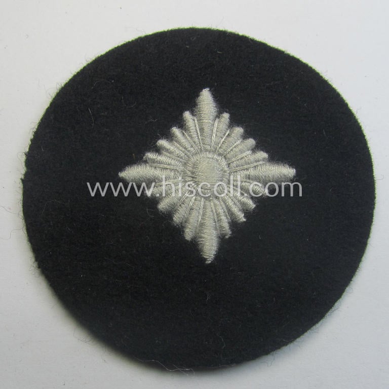 This is a neat example of a Waffen-SS- (ie. Heeres-'Panzer'-) type, machine-embroidered rank-badge (or: roundel) as was executed onto stypical smooth-type- and/or black-coloured wool as was intended for an: 'SS-Oberschütze' (ie. Heeres-Panzer 'Oberschütze') and that comes in an overall very nice- (I deem simply never used- ie. still 'virtually mint- ie. unissued'-), condition. The roundel shows a neatly machine-embroidered, silver-greyish-coloured pip (ie. star) denoting the rank of: 'SS-Oberschütze' (ie. Heeres 'Oberschütze'). The piece shows some minimal aging, dust ie. staining simply caused by decades of storage and/or handling (as can be seen on the pictures). It sounds maybe strange but these 'simple', rank-insignia are not that easy to encounter. I deem that I have priced this (100% genuine- and/or with certainty period-produced!) rank-patch, accordingly!