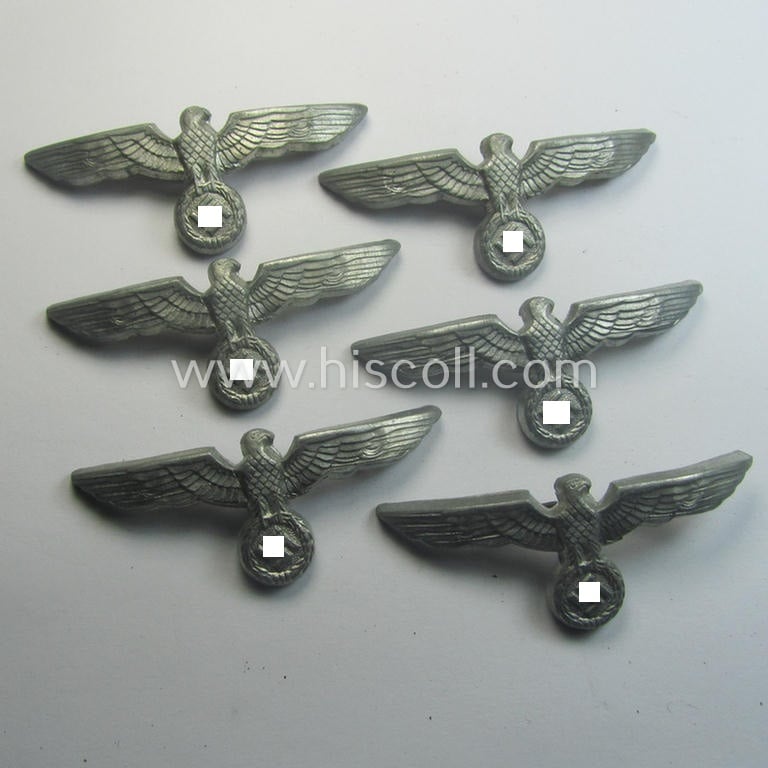 I recently uncovered a small hoard comprising of 6 (fully identical) examples of the 'standard-issue'-pattern, WH (Heeres) EM/NCO-pattern visor- (ie. 'Schirmmützen'-) cap-eagle being all fifteen, typical unmarked examples as executed in greyish-silver-toned, zinc- ie. 'Feinzink'-based metal and that come all in a simply never used- ie. still 'virtually mint- ie. unissued', condition. These specific EM/NCO-pattern cap-eagles were intended for usage on the various WH (Heeres) visor-caps (ie. 'Schirmmützen'-) and saw usage before and/or throughout the war. The eagles of offer here have truly great pronounced detail and retain all their (two) copper-based pins ie. prongs in place (which were I deem never bent and that are of course firmly in place). The pieces are, however, totally void of a makers'-designation on their backs as more often seen (as can be seen on the pictures). The pieces - which are executed in bright-silverish-coloured, zinc- ie. 'Feinzink'-based metal - have an approximate wingspan of 5,4 cms. and have a minimally tarnished 'age-patina' (they were - as stated above - never used nor cap-attached as can be noticed on the pictures). My asking-price is naturally intended for a single specimen. Simply an attractive example of a WH (Heeres) non-maker-marked, 'standard-issue'-pattern visor- (ie. 'Schirmmützen'-) cap-eagle that is nowadays not that easily encountered and that is I deem accordingly priced!