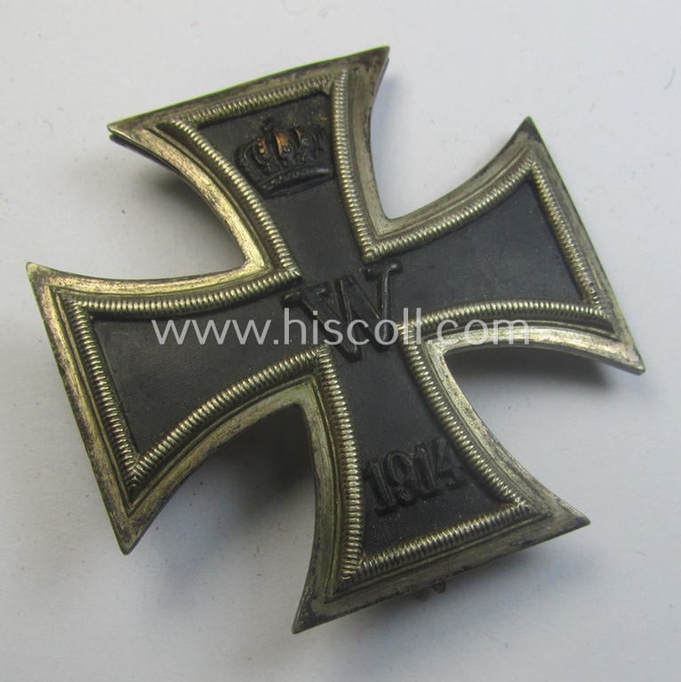 The attractive WWI-period cross - which is a typical quite-vaulted (ie. truly converse!) shaped and and neatly 'copper-coated'! example - has - I deem - never been cleaned and retains a very nice- (albeit minimally tarnished) age-patina and/or great pronounced detail. This WWI-period example - which is a (partly) genuine-silver-based- ie. magnetic example as more often seen - comes mounted onto its original (and naturally fully functional) flute-shaped pin and has a totally unaltered (and also functional!) catch (as can be seen on the pictures). The cross - which shows a nicely preserved, 'blackened'- and/or fairly 'satin-like'- ie. somewhat 'matted'-like 'inner-core' - shows some minimal age but is totally void of any real damage: it retains a very nice appearance overall. The piece is as stated above void of a makers'-designation (as can be seen on the pictures). The cross is, moreover, just a bit dirty and tarnished simply caused by years of storage and/or moderate wear but retains a great unmessed-with and/or uncleaned, age-patina. Simply an attractive IC-first-class that was never before part of a collection: I deem that I have priced this attractive WWI-period example, accordingly!