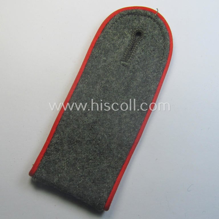 The attractive - and with certainty not that easily found! - WH (Heeres) enlisted-mens'-type shoulderstrap shows the desirable bright-red- (ie. 'hochroter'-) coloured and/or: typical 'rayon'-type piping attached and measures approximately 10,5 cms. in length and is clearly of the simplified. so-called: 'last-ditch'- (ie. 'M44'-) pattern. The shoulderstrap is constructed from the (typical) field-grey-toned, later-war-type wool and comes naturally mounted onto its functional tongue (as can be noticed on the pictures). The strap just shows some minimal age ie. wear and was just minimally used and/or worn as such. It should be noted that these bright-red-piped- (thus 'Artillerie'-related) and/or later-war period- (ie. 'simplified'- ie. 'M44'-pattern-) enlisted-mens'-type shoulderstraps are quite desirable and can easily be graded 'scarce' even more so when they come in such a very nicely preserved condition as the strap on offer here!