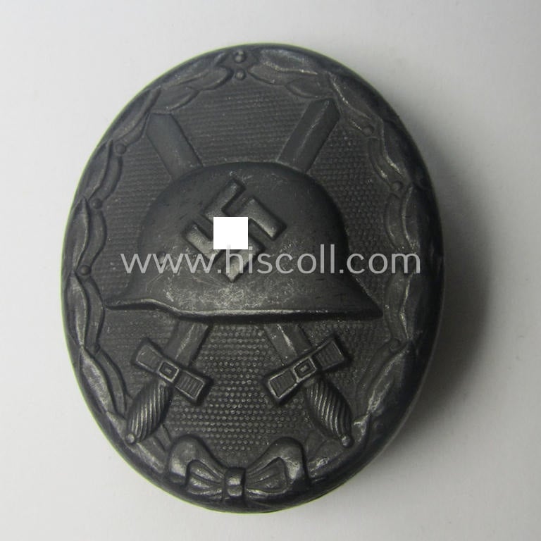 The attractive - and I deem just moderately used- and/or worn! - black-class wound-badge (ie. wound-badge (or: 'Verwundeten-Abzeichen in Schwarz') has lost only some of its original, black-coloured- and/or somewhat 'matted'- ie. satin-like finish: it shows some moderate wear and usage. The wound-badge is - as stated above - neatly (but somewhat vaguely) maker-marked with the makers'-designation: 'L/56' (as is visible on the back of the badge as can be seen on the pictures) signifying that it deals with a piece that was produced by the desirable: 'Funcke & Brüninghaus'-company based in the town of Lüdenscheid. Of course, are the (regular-sized- ie. thin-shaped- and/or also magnetic) pin and/or: (typical) catch (-set-up) fully functional and of course present. This piece has never been cleaned nor polished: it shows some minimal dust and/or minimal staining as to be expected but retains most of its 'matted'- ie. satin-like finish!