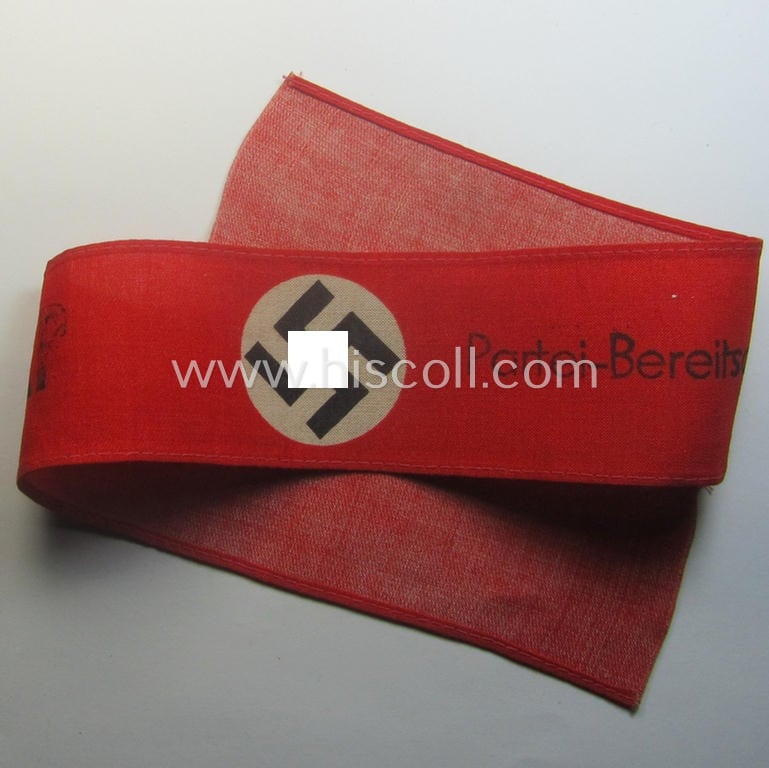 Unusually encountered - and most certainly scarcely seen! - thin-shaped, 'N.S.D.A.P.'-related armband (ie. 'Armbinde') being of the 'entirely printed'-type showing a swastika and text: 'NSDAP - Partei-Bereitschaft'