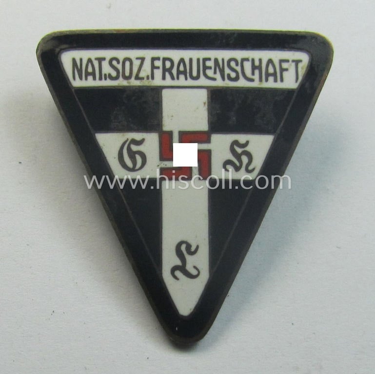 This particular - neatly enamelled and actually quite scarcely found! - 'NS-Frauenschaft'- (ie. NSF-) membership-badge (ie. 'Mitgliedsabzeichen') was intended to signify membership within the German Womens'-Association (or in German-language: 'NS-Frauenschaft') and that was specifically intended for usage by a medium-ranked NSF-official holding the rank of a so-called: 'Frauenschaftsleiterin der Kreisleitung' and that comes in an overall very nice- (and just moderately used- ie. worn-), condition. The example on offer here is one of the regular-sized versions of the series and measures 38 mm. in height (as can be seen on the pictures). The badge comes in an overall very nice and (I deem) only moderately used- ie. worn, condition: the enamelled surface shows some minimal scratches but is totally void of any enamel damage whatsoever (as can be noticed on the pictures). The badge shows a clearly present, superimposed: 'RzM M1/72'-designation on its back: the black enamelled outer 'rim' denotes that the female official who wore this served at: 'Kreis'-level (as can be noticed on the pictures). An identical piece is also figured in the 'Heering-Hüsken'-lapel-pin-catalogue wherein it is given a unique reference-number ('9125MD'). Simply a very attractive - and actually scarcely encountered! - neatly enamelled 'NS-Frauenschaft-Mitgliedsabzeichen' that is (I deem) accordingly priced!