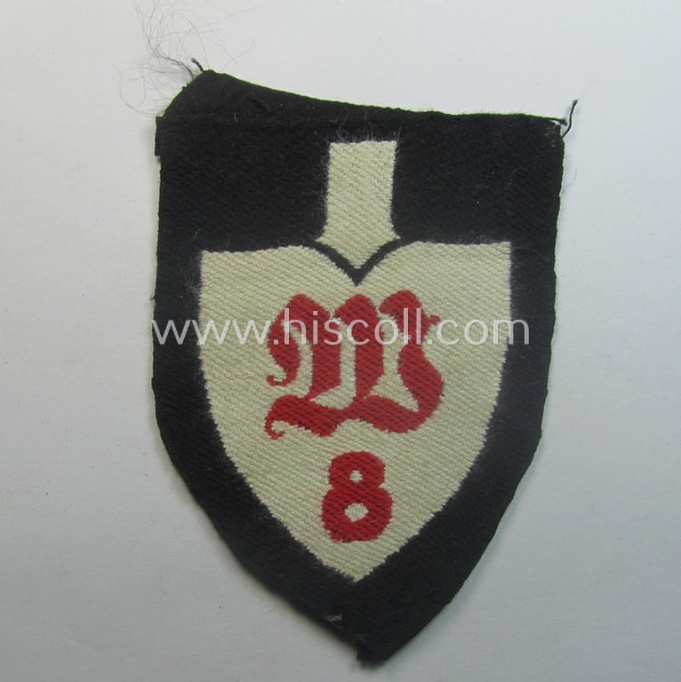 This is an attractive - never before encountered and with certainty scarcely encountered! - EM- (ie. NCO-) pattern of a so-called: RAD (ie. 'Reichsarbeitsdienst') sleeve-badge (or: 'Dienststellen-Abzeichen') bearing the (to date unidentified!) specialist-designation: 'W 8' (of which the exact significance is not known to date!!) and that comes in an overall nice- (ie. clearly used-), condition. These neat badges were worn on the upper left sleeve of the mustard-coloured (EM- ie. NCO-type-) RAD-tunics and/or garments. The badge which shows the bright-red-coloured- (and Gothic-styled) 'W'-character and Latin-styled '8'-numeral) - is neatly executed in so-called: 'BeVo'-weave technique as to be expected. The badge is neatly maker-marked and displays the interwoven so-called: 'Ges.Gesch.'-designation as is more often found on RAD cloth-based badges- and/or insignia. This badge originates from a smaller collection of rarely seen RAD cloth-insignia I recently acquired for the web-site. It should be noted that all RAD arm-badges are comparatively rarely encountered: those intended for specialised functions (ie. bearing specific lettering such as the one on offer here!) even more so!