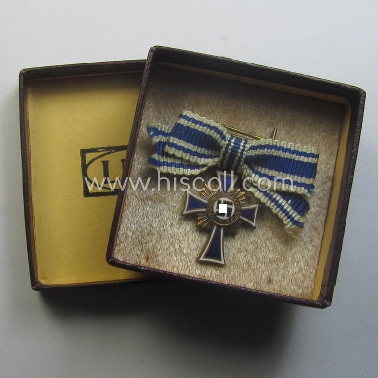 Attractive, 2-cms.-sized miniature of a maker- (ie. 'L/60'- ie. by 'GB'-) marked: 'Ehrenkreuz der Deutschen Mutter in Bronze' that came stored in its non-maker-marked, two-pieced bordeaux-coloured 'LDO'-type box (ie. etui)