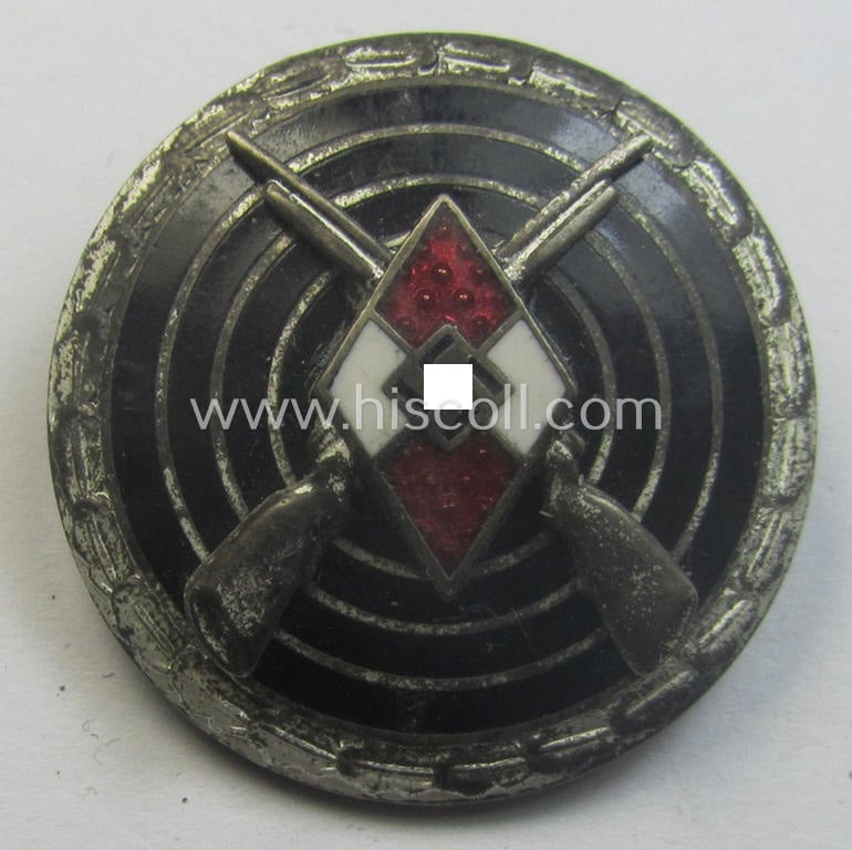 This is an attractive - and fully undamaged(!) - I deem early- (ie. even pre-war-) period example of a HJ ('Hitlerjugend') so-called: 'HJ-Schiessauszeichnung für Scharfschützen' (or: HJ shooting- ie. marksmans'-badge with oakleaf-wreath) being a nicely maker- (ie. 'RzM - M1/102'-) marked example that comes in an overall nice- (I deem surely issued- and/or just moderately worn-), condition. The smaller-sized badge (which is equally sized as an N.S.D.A.P.-membership lapel-pin) is as stated above, neatly marked on the back with the maker'-designation 'M1/102' as mentioned above. The lapel-pin was never cleaned (some age ie. staining is present) but the piece truly shows no enamel-damage whatsoever (it was most certainly never cleaned nor polished and shows a somewhat tarnished, typical silver-coloured finish). The badge comes naturally mounted onto its fully functional (and unaltered) pin- ie. pin-catch set-up. Simply a neat - and actually not that often seen! - youth-related marksman'-badge: hard to find a better and more nicely preserved example for a more interesting price!