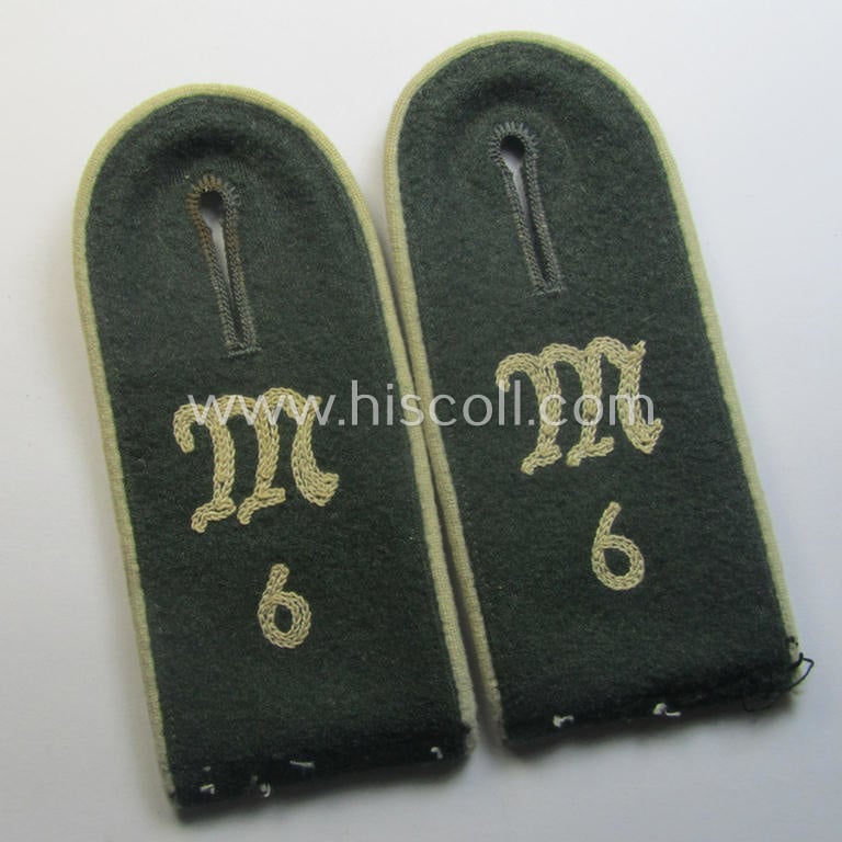 Truly worn- and/or tunic-removed pair of early-period (ie. 'M40'-pattern and/or rounded-styled), WH (Heeres) 'cyphered' EM-type shoulderstraps as was intended for a: 'Soldat des Inf.-Maschinengewehr-Abts. 6'