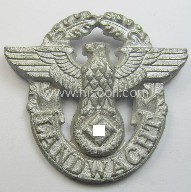 This is an attractive example of a detailed - and typical zinc- ie. 'Feinzink'-based - 'Polizei'- (ie. police) eagle-badge (as was I deem intended for usage on a field-cap) being a silverish-grey-coloured- and/or non-maker-marked example depicting the text: 'Landwacht' and that comes in an overall very nice- (I deem hardly used- ie. 'virtually mint- ie. unissued'-), condition. The detailed badge is executed in bright-silver-coloured zinc-based metal and shows a period-attached (and still functional) 'clip' on its back. The detail on the mininially stained (but never cleaned) piece is quite extraordinary: it just shows some minimal dust ie. tarnish simply caused by decades of storage only. In January 1942, the 'Reichsführer-SS' Heinrich Himmler in his position as: 'Chef der Deutschen Polizei im Reichsministerium des Innern' (ie. Chief of the German Police in the National Ministry of the Interior) established a new police-related service to be called: the 'Landwacht' (or: land-watch guard-troops) to be utilised in guarding prisoners of war when on work outside of the prisons ie. POW-camps but within the borders of the greater German Reich. The 'Landwacht' staff-members were outfitted with standard-pattern 'Gendarmerie' (ie. rural police) police uniforms with a distinctive identifying armband and cap-badge (such as the badge on offer here). The badge was (I deem) clearly used and does show a tiny 'flaw' on its right underside (as can be noticed on the pictures. Hard to find a more attractive example for a more interesting price!