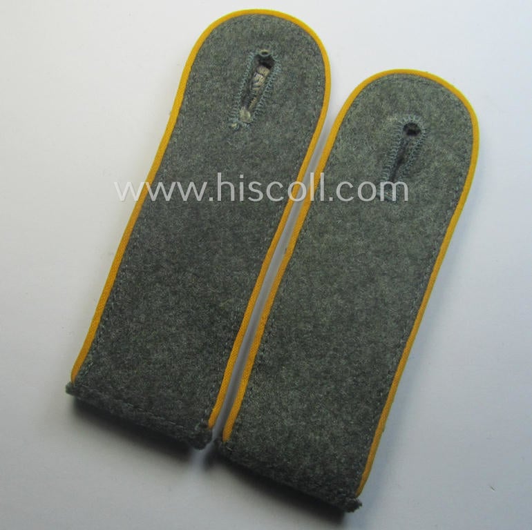 This is an attractive - fully matching and (I deem) early-war-period! - pair of 'standard-issued'-pattern, WH (Heeres) early- ie. pre-war period- (ie. 'M40'- ie. 'M41'-pattern), enlisted-mens'-type shoulderstraps (ie. 'Schulterstücke für Mannschaften des Heeres') as was piped in the desirable golden-yellow- (ie. 'goldgelbener'-) coloured branchcolour as was specifically intended for usage by a: 'Soldat eines Kavallerie- o. Reiter-Regiments' (or: simple soldier who served within one of the cavalry regiments) and that comes in an overall very nice- (ie. I deem just minimally used- ie. worn-), condition. The neat straps - which have the 'standard'-pattern, field-grey-coloured and/or typical 'smooth woolen'-based 'upperdecks' and that measure approximately 11,7 cms. in length each - show the neat golden-yellow- (ie. 'goldgelbener'-) coloured and/or (typical) woolen-type piping attached (as can be seen on the pictures). The pair comes naturally mounted onto their period-attached- (regular-shaped) tongues attached and comes in a very nice- (ie. fully 'text-book') condition overall (as can be seen on the pictures). These type of shoulderstraps are of the fairly early-war-period pattern straps and were worn in the period around 1940 (and were 'worn-out' even during the rest of the war). The pair only shows minimal wear and/or age and is just nicely preserved over the years (as can be seen on the pictures). I deem this an excellent occasion to acquire a neat - and most certainly desirable! - EM-type, 'Kavallerie o. Reiter'-related, Heeres-EM-type shoulderstrap-pair for a justified price!