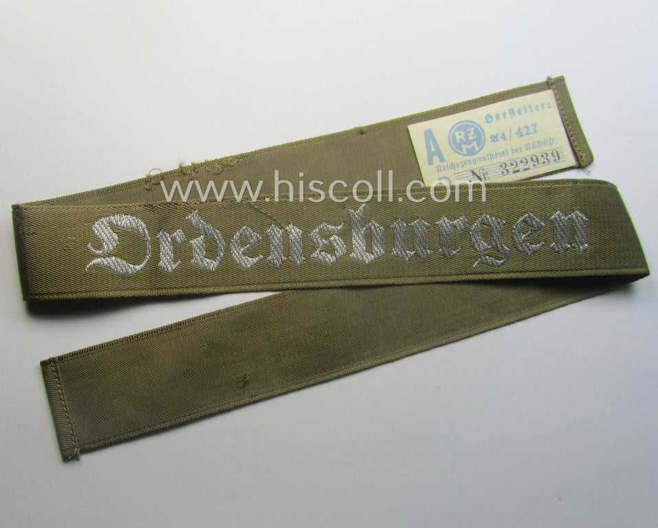 Superb - full length and 'flat-wire'-woven! - 'N.S.D.A.P.'- (ie. 'Politische Leiter'-) related cuff-title (ie. 'Ärmelstreifen') entitled: 'Ordensburgen' (being a 'virtually mint- ie. unissued' example that still retains its 'RzM'-etiket)