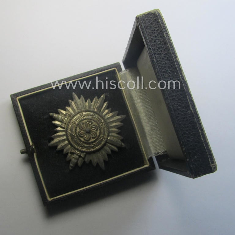 This is an attractive - just moderately used and actually fairly scarcely encountered! - WH-related, so-called: 'Tapferkeitsauszeichnung o. Steckkreuz für Angehörige der Ostvölker, 2. Kl. in Silber mit Schwertern' (or: silver-class 'Ostvölker' bravery-medal ie. breast-star for bravery on the Eastern Front being of the second-class-pattern with swords) being a (typical) non-maker-marked- and/or: silverish-toned, 'Feinzink'-based example that comes stored in its period-etui as issued and/or recently found. The neat award comes in an overall very nice- (I deem moderately used ie. worn-) condition and retains a nicely preserved silverish-toned finish and retains great pronounced detail (it is just a tiny bit tarnished- ie. dirty as to be expected but was never cleaned nor polished: it comes naturally mounted onto its functional (and unaltered) pin- and/or pin-catch set-up as can be seen on the pictures). The etui comes in an equally nicely preserved condition: it is fully functional and is nicely preserved (as can be seen on the pictures). The faily luxuriously-styled etui (that shows the typical 'square-shaped corners' as more often) has a fully preserved, black-coloured (ie. simulated velvet-) interior-section that shows a clear imprint of the badge it once held (as can be seen on the pictures). The etuis'-top shows an (almost fully preserved and silver-toned) illustration of the badge (as can be seen on the pictures). The etui was I deem just moderately used and does show some obvious - albeit minimal - age, wear and/or staining. Simply a attractive - and desirable! - WH-related, so-called: 'Tapferkeitsauszeichnung o. Steckkreuz für Angehörige der Ostvölker, 2. Klasse in Silber mit Schwertern'-set that is I deem accordingly priced!