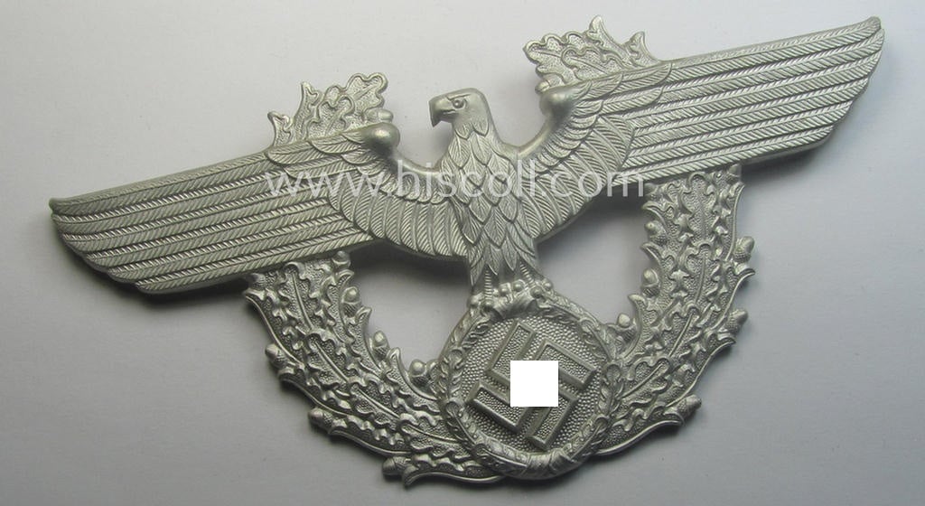'Standard-issue'-pattern- and aluminium-based, 'Polizei'- (ie. police) 'Tschako' cap-eagle being a bright-silver-coloured- and/or non-maker-marked example as was intended for usage on the various 'Polizei' (ie. police) 'Tschakos'