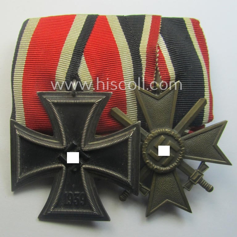 Two-pieced medal-bar (ie. 'Orden- o. Doppelspange') showing resp. an: 'Eisernes Kreuz II. Kl.' and a: 'Kriegsverdienstkreuz II. Klasse mit Schwn.' that both come period-mounted as a: 'Doppelspange'