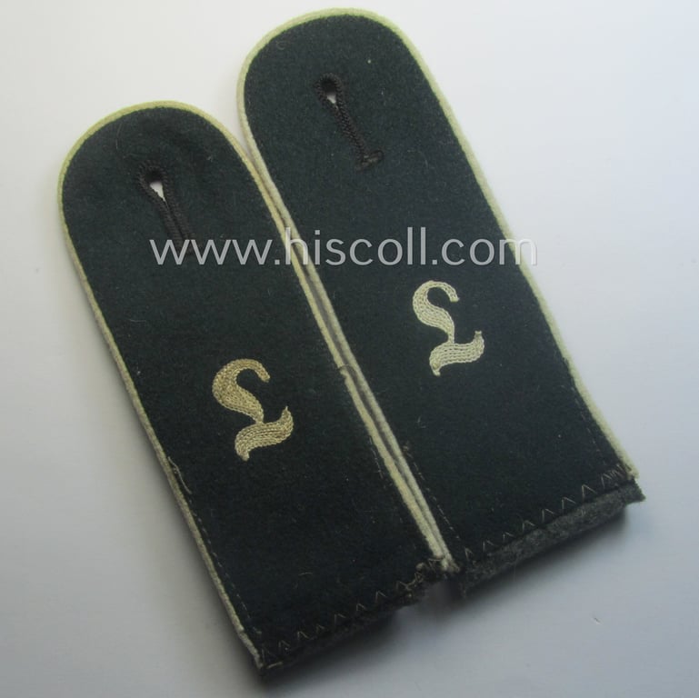 This is an attractive - fully matching, very desirable and actually not that easily found! - pair of WH (Heeres) early- (ie. evt. pre-) war-period, so-called: 'M40'-pattern and neatly 'cyphered', enlisted-mens'-type shoulderstraps as piped in the white- (ie. 'weisser'-) coloured branchcolour as was specifically intended for - and clearly worn by! - a: 'Soldat einer Infanterie Lehr-Bataillons o. Regiments' (or: private who served within an army-infantry training ie. instruction battalion or regiment) and that comes in an overall nice- (albeit moderately used ie. worn-), condition. The neat shoulderstraps - which are approximately 13 cms. sized in length each - do show the darker-green-coloured- and/or (smooth) woolen-based 'upperdecks' and show the neat (white-toned, Gothic-styled and regular-sized) so-called: 'L'-cyphers (ie. 'Ziffern') attached (which cyphers are executed in typical 'Kurbelstickerei' as can be seen on the pictures). The straps - which came mounted onto their functional - and I deem period-replaced! - tongues show as stated above only minimal usage and/or wear (some minor staining and/or dust is visible and/or present). This pair originates from an older shoulderstrap ie. board-collection that I recently acquired for the web-site. Simply a very attractive and/or: early-war-period, neatly 'cyphered' and/or 'Heeres'-related EM-type shoulderstrap-pair that was intended for usage by a: 'Soldat einer Infanterie Lehr-Bataillons o. Regiments'!