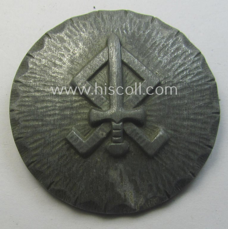This is an attractive - and fairly rarely- ie. with certainty unusually encountered! - (amongst others) Dutch volunteer-related breast-badge as was intended for usage by members who served within the: 'Germanische Landdienst' being a detailed example that comes in an overall nice- (ie. I deem only moderately used- ie. worn-), condition. These attractive (breast)badges were worn by all European (incl. the Dutch-) volunteers that worked for a determined period within the so-called: 'Germanische Landdienst'. The badge on offer here - is executed in silverish-grey-coloured zinc- (ie. 'Feinzink'-) based metal (as always) and comes in an overall nice- and/or totally uncleaned condition: it comes as recently found. The badge shows its period-attached pin-/catch set-up which is naturally still functional (as can be seen on the pictures). The badge has - I deem - clearly been worn and was never cleaned or polished: it retains an attractive, typical zinc-like age-patina. A similar example of this rare badge is also figured in the 'Heering/Hüsken'-lapel-pin catalogue wherein it has been given the unique reference-number: 'K8 05A' and given an estimated value of 500 Eu (!). Simply an attractive - and with certainty rarely encountered! - Germanic volunteer-related breast- badge that is most certainty accordingly priced!