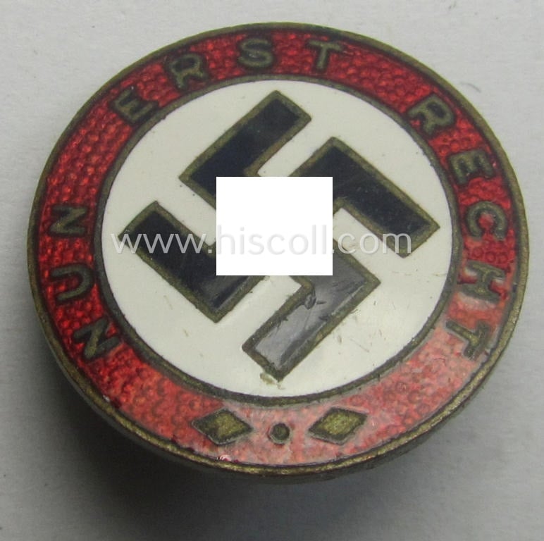 Neatly enamelled- (and bright-red-coloured!) smaller-sized (and I deem early-period) so-called: 'N.S.D.A.P.'-supporters'-badge showing the text: 'Nun erst Recht!') and that comes in a wonderful condition
