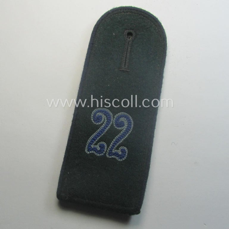 This is an attractive - regrettably single but but nevertheless truly scarcely found! - fairly early- (ie. rounded-styled), neatly 'cyphered', WH (Heeres) enlisted-mens'-type (ie. 'M40'-pattern) shoulderstrap as piped in the darker-blue- (ie. 'blauer'-) coloured branchcolour as was specifically intended for - and just moderately used by! - private (ie. 'Soldat' ie. 'Sanitäter' or medical-orderly) who served within the: 'Sanitäts-Abteilung 22' and that comes in an overall very nice- (albeit minimally used ie. worn- and/or most certainly once tunic-attached-), condition. The strap is just moderately worn and does show some minimal wear, age and/or staining but is void of any damage or alike (as can be seen on the pictures). The strap shows the desirable darker-blue- (ie. 'blauer'-) coloured - and/or woolen-type piping attached and measure approximately 11,7 cms. in length. The piece came mounted onto its period tongue attached and showd the so-called (double): '2'-cyphers (ie. 'Ziffern') which are neatly machine-embroidered by means of so-called: 'Kurbelstickerei' (as can be seen on the pictures). Both 'cyphers' are executed in the darker-blue- (ie. 'blauer'-) coloured coloured wool ie. linnen (and are neatly additionally-piped in light-blue!) as to be expected. The strap is constructed from the typical darker-green-coloured wool and is with certainty a 'standard-issued'-specimen. These type of shoulderstraps are of the fairly early-war-period-pattern straps and were worn in the period around 1939/1940 (and were 'worn-out' even during the rest of the war). This particular strap originated from a larger cloth- ie. 'cyphered'-shoulderstrap-collection I recently acquired for the web-site. Simply a very attractive - and with certainty desirable! - 'cyphered', 'Sanitäter'-related EM-type shoulderstrap that belonged to a: 'Soldat des Sanitäts-Abteilung 22'. I deem that I have priced this very attractive - and scarcely encountered! - EM-strap according to its desirabilty and overall very nicely preserved condition!