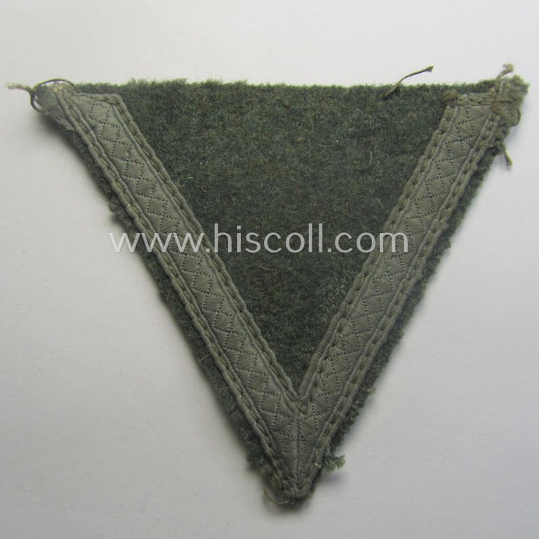 This is an attractive - and I deem just moderately used- and/or carefully tunic-removed! - example of a WH (Heeres) 'Armwinkel' (ie.: arm-chevron) as was executed on a typical, field-grey-coloured- and/or woolen-based background as was intended for usage by a soldier with the rank of: 'Gefreiter' (ie. private first-class) and that comes in an overall very nice- (and I deem clearly used-), condition. The chevron is neatly executed and shows a single stripe of bluish-grey-coloured- (ie. truly 'sub-dued') and/or 'standard'-pattern NCO-braid (as can be seen on the pictures). The piece is void of any backing (as can be seen on the pictures). It sounds maybe strange but these 'simple' Heeres-related rank-insignia are quite hard to encounter. Simply an attractive WH-rank-badge that is I deem accordingly priced!