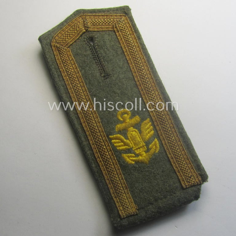This is an attractive - albeit regrettably single but nevertheless not that often seen! - 'cyphered'- (and I deem typically early- ie. mid-war-period-pattern) NCO-type shoulderstrap as was specifically intended for usage on the field-grey coloured navy-style tunics by an NCO holding the rank of an: 'Unteroffizier eines Küsten-Artillerie-Regiments' (or: junior-sergeant serving within a naval, coastal-artillery unit) and that comes in an overall nice- (albeit moderately used ie. worn-), condition. The strap - which is fully 'text-book' in all facets and that measures approximately 12 cms. in length (and has a width of 5,7 cms. as usually seen) has a field-grey-coloured- and/or woolen-based 'upperdeck' and comes mounted onto its functional tongue. The strap shows the typical (golden-toned) KM-pattern NCO-braid attached and shows a neat interwoven 'winged shell'-cypher (as executed in golden-yellow-coloured linnen). The strap shows some moderate age and/or wear (as can be seen on the pictures). It should be noted that ALL 'Küsten-Artillerie' insignia-pieces are actually quite hard to encounter: those 'cyphered' examples even more so, which grades them easily as 'scarce'. Simply an attractive, neatly 'cyphered' naval NCO-type shoulderstrap that was intended for usage on the field-grey-coloured attire: too bad it is only a single example!