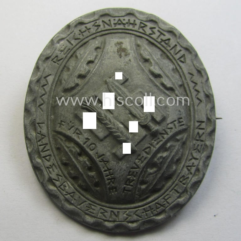 Unusally seen, 'Reichsnährstand'- (ie. 'RNSt.'-) related loyal-service brooch ('Brosche') being a non-maker-example showing the (Runic-styled!) text: 'Reichsnährstand - Landesbauernschaft Bayern - für 10 Jahre Treue Dienste'