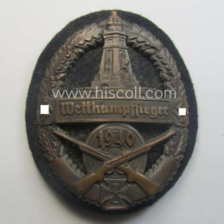 The attractive (and typical!) reddish-bronze-toned (and I deem luxuriously-styled- and/or: neatly 'Cupal'-based!) so-called: 'Kyfhäuserbund Schiessauszeichnung' (or: shooting- ie. marksmans'-badge) on offer here is a non-maker marked example depicting the famous 'Kyfhäuser'-monument, Iron Cross-symbol and double 'swastika'-devices and bearing the text: 'Wettkampfsieger 1940' and that comes in an overall very nicely preserved condition. The badge on offer here shows some minimal wear and/or age but has truly been nicely preserved over the years. The somewhat converse-shaped badge comes naturally mounted onto its typical (double) darker-blue-coloured- and/or woolen-based 'backing' and has simply never been cleaned nor polished: most of its (off-factory!) polished-sides are present and very nicely preserved (as can be seen on the pictures). The piece is very detailed and truly retains all of its fairly bright and/or: minimally tarnished bronze-coloured finish and/or fully preserved (darker-blue-toned- and woolen-based) backing. Simply a neat - and not that often seen! - 'Kyfhäuserbund Schiessauszeichnung' (or: shooting- ie. marksmans'-badge) from the year 1940 and that is accordingly priced!