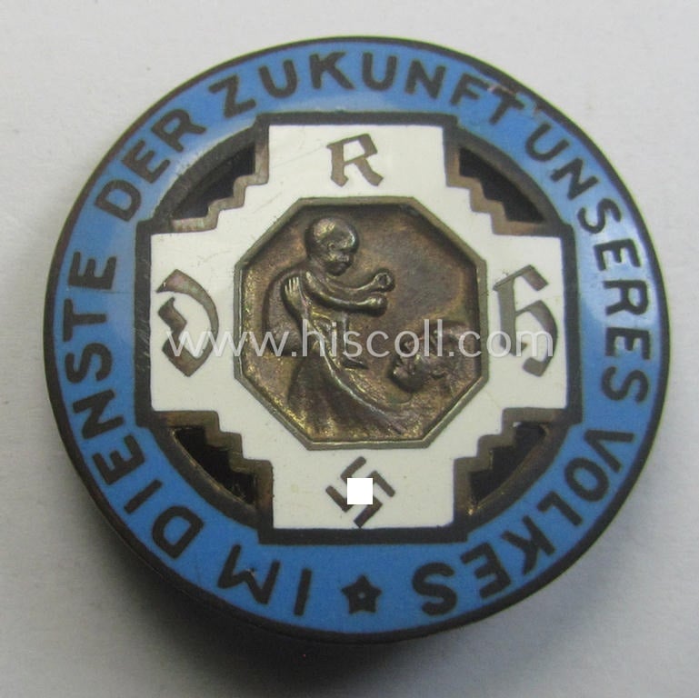 This is an attractive - and actually fairly scarcely encountered! - example of a nicely executed (ie. colourful enamelled) 'service-brooch' (or: 'Dienstbrosche') as was intended for usage by a female member (ie. midwife) who served within the: 'Allgemeiner Deutscher Hebammenverband' (or 'ADHV') (ie. midwife war-service association) and that comes in an overall nice- (albeit clearly used ie. worn-), condition. The service-brooch - which has an approximate width of 4 cms. - shows an illustration of a nurse holding a child surrounded by the text: 'Im Dienste der Zukunft unseres Volkes': moreover, is this the scarcely found pattern that shows a swastika. The piece - which is executed in neatly enamelled metal (ie. 'Buntmetall') - is a tiny bit dirty ie. stained but was most certainly never cleaned ie. polished: it is still a bit dirty ie. dusty but is totally void of any (enamel)damage. This example is void of a makers'-designation but does show a 'Ges.Gesch.'-patent-pending-designation on its back. The pin - which comes mounted onto its functional pin- ie. pin/catch set-up - is also figured in the Heering-Hüsken lapel-pin-catalogue, wherein it is given a unique reference-number (5801A). The example on offer here originates from a German private-household and was never before in collectors'-hands. Simply an attractive - and surely decorative! TR-period, female-related lapel-pin (with swastika!) that is with certainty accordingly priced!