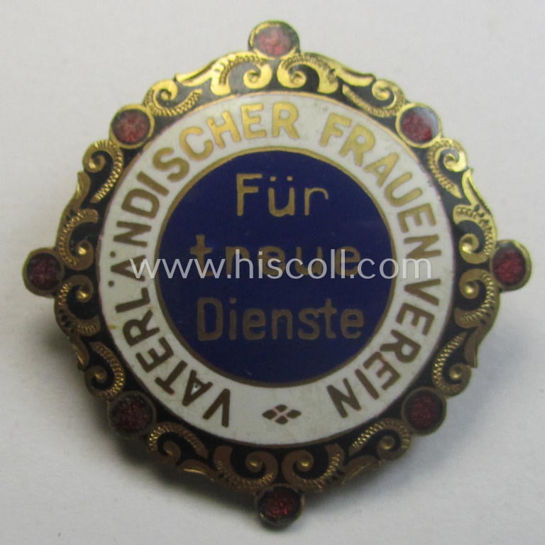 Unusual, 'Vaterländischer Frauen-Verein vom Roten Kreuz' so-called: nurses'-loyal-service-badge entitled: 'Für treue Dienste' (being a round-shaped, non-maker-marked and neatly enamelled specimen)