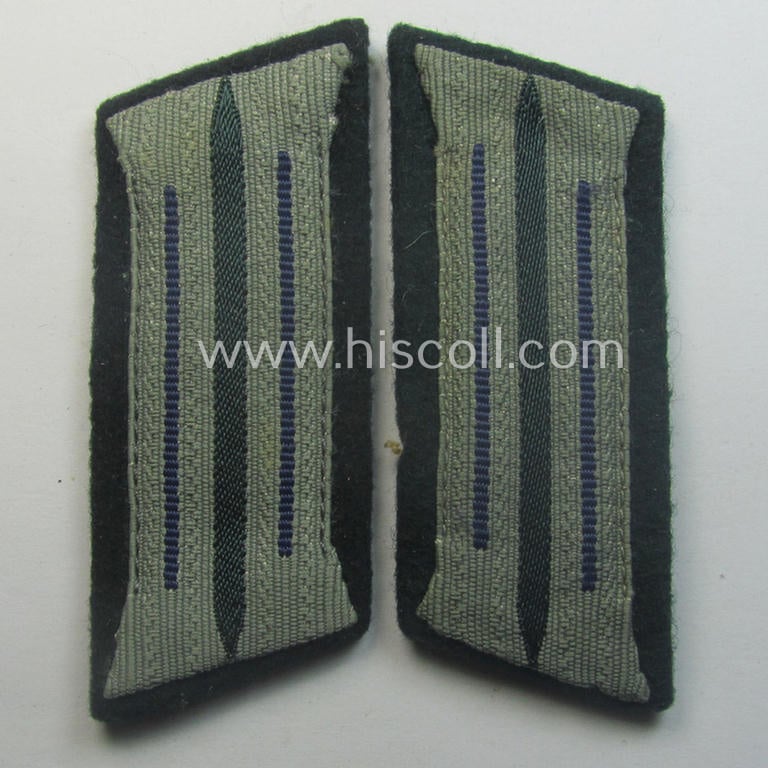 This is a neat - and fully matching! - pair of (I deem) early-war period, WH (Heeres) 'M36' (ie. 'M40'-) type collar-patches (ie. 'Einheitskragenspiegel') as piped in the darker-blue- (ie. 'blauer'-) coloured branchcolour as was specifically intended for usage by a: 'Soldat der Sanitäts-Truppen' (or: soldier ie. NCO and medical orderly who served within an army medical-unit ie. regiment) that comes in a very nice- (ie. I deem) still 'virtually mint- ie. unissued', condition. The tabs have the desirable darker-blue- (ie. 'blauer'-) coloured branchcolour signifying that they were intended for a soldier (ie. NCO) who served within an army medical-unit. Both tabs are nicely 'pre-mounted' (ie. machine-stitched) onto a darker-green-coloured- (and/or 'smooth'-woolen-based) background as more often seen (as can be seen on the pictures). The pair - which was (I deem) never mounted onto a tunic - shows the neat beige/brown-coloured 'buckram'-based backings as is more often encountered (as can be seen on the pictures). Simply a great occasion to acquire a very nice - and actually not that easily encountered! - 'M36' (ie. 'M40'-) type collar-tab-set in a desirable branchcolour ie. 'Waffenfarbe'!