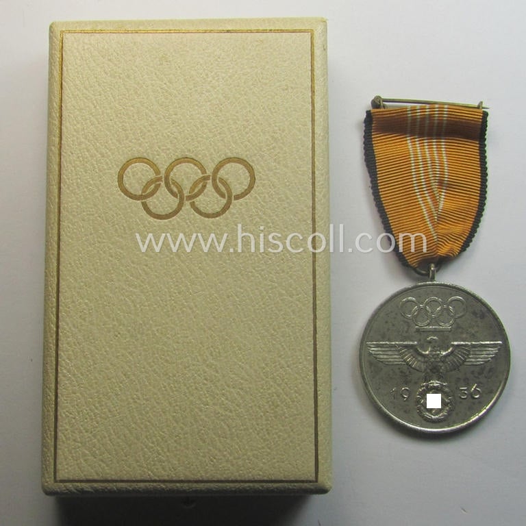 'Deutsche Olympia-Erinnerungsmedaille 1936' being a non-maker-marked example that comes mounted onto its original ribbon (ie. 'Bandabschnitt') and that comes stored in its typical, beige-white-coloured etui