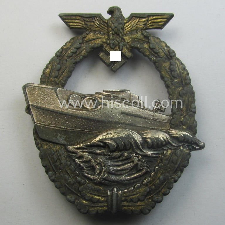 Superb, WH (Kriegsmarine) so-called: 'Kriegsabzeichen für Schnellboote - 2. Modell' (or: E-boat-war-badge of the 2nd model) being a maker- (ie. 'Fec. W.E. Peekhaus'-) marked example as was produced by the: 'Schwerin'-company