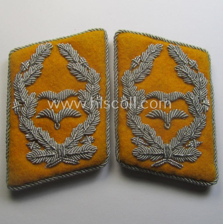 This is a very attractive - fully matching and actually not that easily found! - pair of WH (Luftwaffe) officers'-type collar-patches (ie. 'Kragenspiegel für Offiziere der Luftwaffe') as executed in golden- ie. somewhat orange-yellow- (ie. 'goldgelbener'-) coloured- and/or: smooth-type- ie. 'moleskin'-type wool, as were specifically intended for usage by an: 'Oberstleutnant der Flieger-o. Fallschirmjäger-Truppen' (or: lieutnant-colonel who served within the pilot- or paratrooper-branch) and that comes in an overall very nice- (ie. I deem just minimally used- and/or carefully tunic-removed-), condition. The pair is truly neatly hand-embroidered and shows great detail and/or craftmenship. The tabs have the 'standard-type', beige-coloured- and/or 'buckram'-based 'backings' attached as to be expected: moreover, do both tabs show four metal-based 'snaps' each which were intended to attach the tabs to a (summer?) tunic (as can be seen on the pictures). This pair originated from a private-household in Germany where it was recently found: this pair belonged to a (regrettably unidentified) 'Oberstleutnant der Flieger-o. Fallschirmjäger-Truppen' who wore these pieces and stored them for decades. Simply a nice occasion to acquire a very attractive pair of (high-ranked!) LW officers'-type collar-tabs for a justified price!