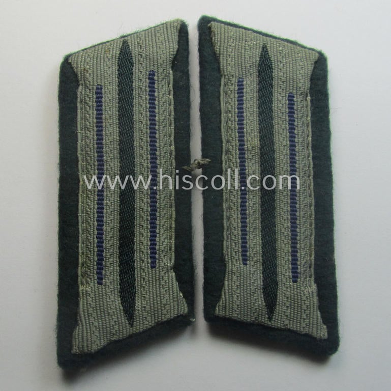 This is a neat - and fully matching! - pair of (I deem) early-war period, WH (Heeres) 'M36' (ie. 'M40'-) type collar-patches (ie. 'Einheitskragenspiegel') as piped in the darker-blue- (ie. 'blauer'-) coloured branchcolour as was specifically intended for usage by a: 'Soldat der Sanitäts-Truppen' (or: soldier ie. NCO and medical orderly who served within an army medical-unit ie. regiment) that comes in a very nice- (ie. I deem) still 'virtually mint- ie. unissued', condition. The tabs - which came still attached to each other - have the desirable darker-blue- (ie. 'blauer'-) coloured branchcolour signifying that they were intended for a soldier (ie. NCO) who served within an army medical-unit. Both tabs are nicely 'pre-mounted' (ie. machine-stitched) onto a darker-green-coloured- (and/or 'smooth'-woolen-based) background as more often seen (as can be seen on the pictures). The pair - which was (I deem) never mounted onto a tunic - shows the neat beige/brown-coloured 'buckram'-based backings as is more often encountered (as can be seen on the pictures). Simply a great occasion to acquire a very nice - and actually not that easily encountered! - 'M36' (ie. 'M40'-) type collar-tab-set in a desirable branchcolour ie. 'Waffenfarbe'!