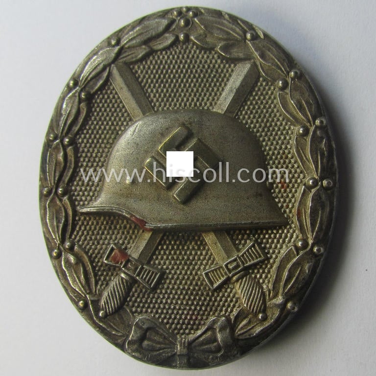 The attractive - and just moderately used albeit typical zinc- (ie. 'Feinzink'-) based - silver-class wound-badge (or: 'Verwundeten-Abzeichen in Silber') shows only minimal age and wear and still retains almost all of its original, silverish-grey-coloured- (ie. typical zinc-like-) finish: it just shows some minimal wear and/or age (as can be seen on the pictures). The badge is as stated neatly maker-marked with the super-imposed makers'-designation: '65' on its back (as can be seen on the pictures) signifying that it deals with a typical piece as was produced by the: 'Klein u. Quenzer'-company as based in the town of Oberstein a.d. Nähe. Of course, are the (regular- ie. thin-shaped-) pin and/or (typical molded) catch (-set-up) fully functional and of course present. This piece has never been cleaned nor polished: it shows some minimal age, dust and/or staining as to be expected. Simply a very nicely preserved and just moderately worn example that is I deem accordingly priced!