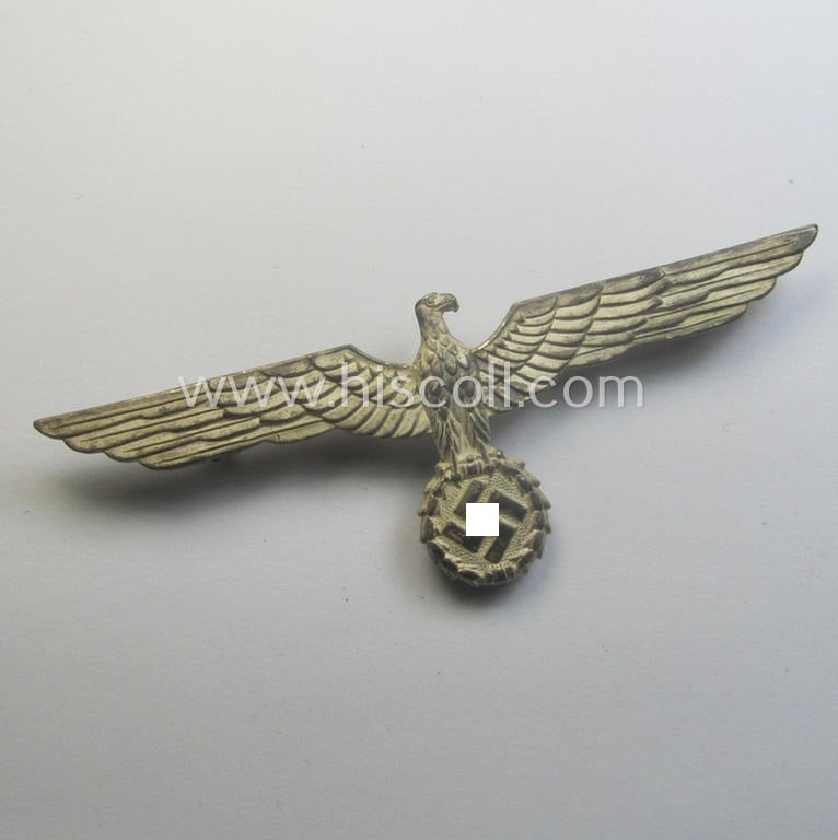 This is a neat example of a WH (Heeres- o. Kriegsmarine) 'frosted'-silver-toned- (and I deem 'Buntmetall'-based) officers'-pattern breast-eagle (ie. 'Metallbrustadler für die Sommeruniform der Offiziere des Heeres o. Beamte der Kriegsmarine)' as was specifically intended for usage on the white-coloured, summer-tunics (ie. 'Sommerblusen') and that comes in an overall nice- (I deem just moderately used- and/or worn-), condition. The (as more often unmarked) piece is a 'standard-pattern'-example that has a detailed- (and just somewhat 'tarnished') appearance. The piece was only moderately used and does show some age and/or staining (ie. tarnished appearance) as to be expected: it was most certainly never cleaned nor polished and retains most (ie. all!) of its silverish finish (as can be seen on the pictures). The piece comes mounted onto its original, silver-toned (and naturally functional) pin (ie. pin-set-up) and retains its additional 'third'-pin (which is not always the case) as can be seen on the pictures. Simply a neat (officers'-pattern) 'Heeres o. Kriegsmarine'-related summer-tunic breast-eagle: hard to find a better example for a more interesting price!