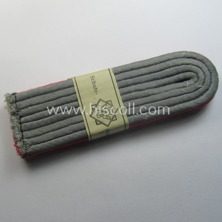 The very attractive - and with certainty unusually seen! - pair of WH (Heeres), officers'-type shoulderboards is neatly piped in the typical bright-pink- (ie. 'rosaroter'-) coloured branchcolour and that was as such intended for usage by a junior-officer holding the rank of a: 'Leutnant der Panzer- o. Panzer-Jäger-Truppen' (or: lieutnant who served within a within a tank- or anti-tank/tank-destoyer regiment or unit) and that comes in an overall very nice- (I deem simply never used- nor worn- ie. still 'virtually mint- ie. issued'-), condition. The boards have the (truly sub-dued) silverish-grey-coloured 'upperdecks' (as can be noticed on the pictures). The boards show the desirable bright-pink- (ie. 'rosaroter'-) coloured branchcolour (and were constructed from the typical 'smooth'-type wool as to be expected). The boards never had any tongues attached and were most certainly intended to be used as a pair of the 'sew-in'-pattern. The boards measure approximately 11 cms. in length each and were possibly issued- but simply never worn and do just show some storage-age ie. staining as to be expected. The pair was recently found at a German private-household and comes in a fully untouched and still 'packed' and never opened condition: the pair still has its period, paper-based 'Banderolle' attached (that shows the makers'-desigination: 'Schutzmarke RWB' (as can be noticed on the pictures). Simply a very attractive - and desirable! - WH (Heeres), officers'-type shoulderboard-pair that was intended for usage by a: 'Leutnant der Panzer- o. Panzer-Jäger-Truppen' and that will be impossible to be upgraded!