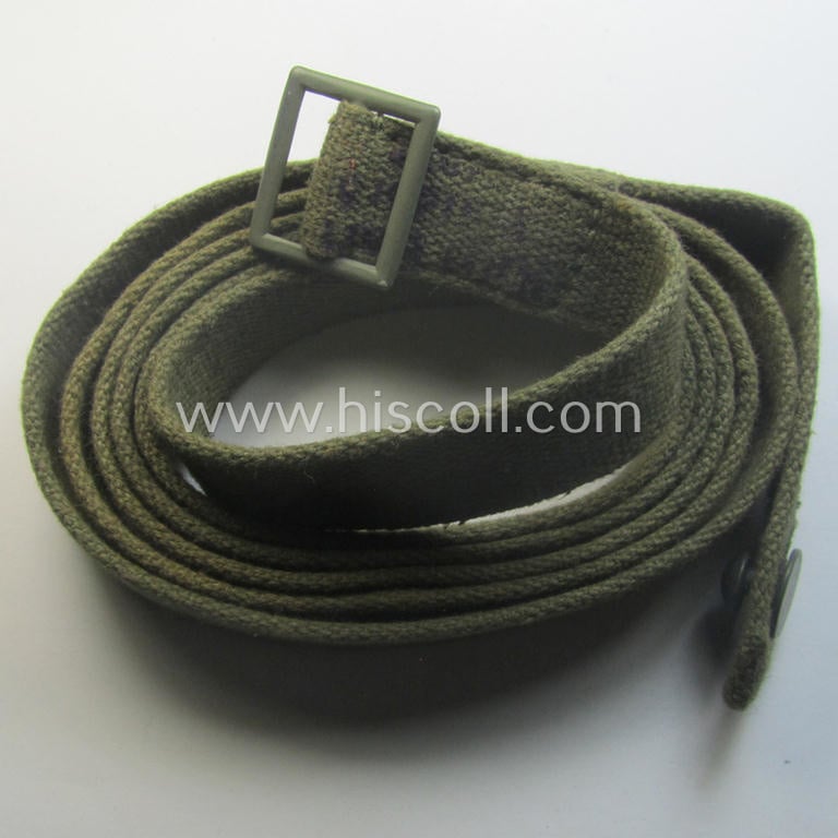 This is a neat, personal-equipment-item that is often missing: a 'standard-issued'-pattern- (ie. typical WH-issue) greyish-green-coloured- and/or typical linnen-based carrying-strap (ie. 'Tragelasche') as was intended for usage onto the various WH-gasmask-containers being a neatly maker-marked example that comes in an overall very nice- (I deem hardly used- ie. still 'virtually mint- ie. unissued', condition). The long-sized strap has a field-grey-coloured (and I deem zinc-based) 'buckle' attached (as can be noticed on the pictures). The piece - that shows some truly minimal age- ie. staining - comes with its period, equally field-grey-toned 'snap' still in place (something that is not always the case). As stated above is the piece clearly maker-marked (with a blue-inked stamp) which is, regrettably impossible to decypher: I can only make out a date: '1938'). Simply a nice occasion to acquire a scarcely found (I deem somewhat early-period!) WH-equipment 'spare-part' that will be very hard to be upgraded!