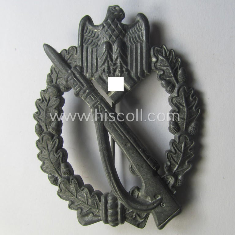 'Infanterie-Sturmabzeichen in Silber' (or: silver-class infantry-assault badge ie. IAB) being a neatly maker- (ie. 'MK 1'- or: 'Metall u. Kunststoff'-) marked example as executed in greyish-silverish-coloured 'Feinzink'