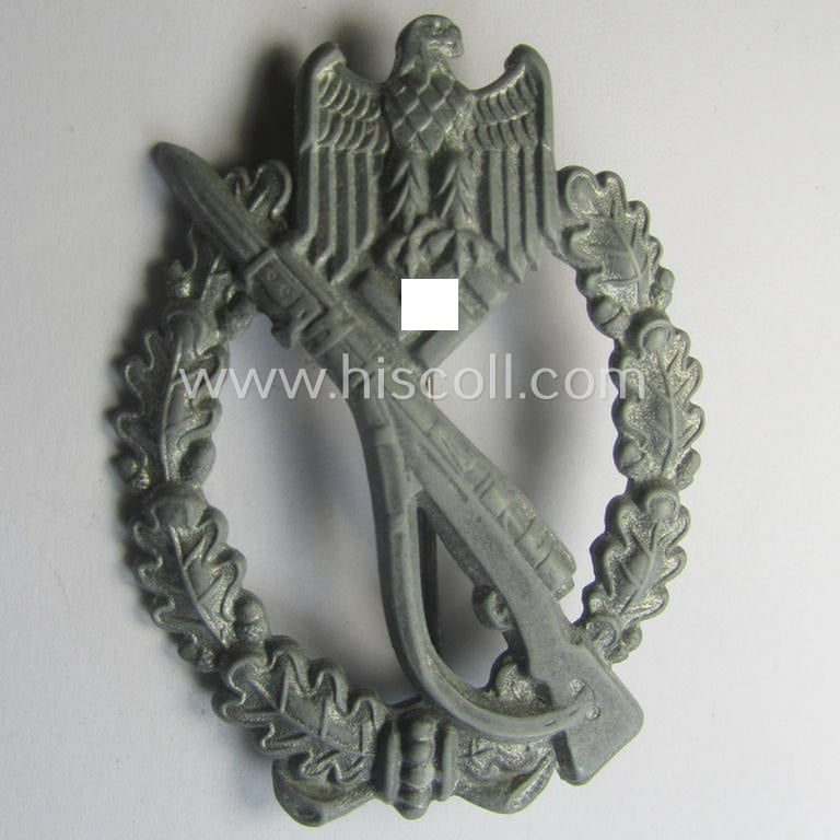 This is a neat - regrettably incomplete and I deem just moderately used and/or worn but nevertheless still nicely preserved! - so-called: 'Infanterie Sturmabzeichen in Silber', being an unmarked (and/or converse- ie. vaulted) 'hollow-back' example as was produced by the maker: 'Friedrich Linden' (ie. 'F.L.L.') as was executed in silver-coloured, zinc-based metal (ie. 'Feinzink') and that comes in an overall nice- (and I deem just moderately used-), condition. It deals with a neat - and I deem only minimally used and/or worn - non-maker-marked war-badge: it has a 'typical' (crimped and riveted but regrettably broken-off) catch- and/or hinge (-set-up). I deem that this example can with certainty be determined as a 'mid-war-period-variant' that can be attributed to the maker: 'Friedrich Linden' (ie. 'F.L.L.') as based in the town of Lüdenscheid. The badge was with certainly issued and comes in an only minimally used- and/or worn, condition (as can be seen on the pictures). It was I deem never cleaned nor polished and truly retains most of its silverish-grey-coloured finish as can be seen on the pictures (something that is NOT always the case with these mid-war-period 'FLL'-examples). The pin is of course present but the (typical) catch (ie. set-up-) is regrettably (partly) broken-off. The piece - which originates from a private-household in Germany where it was recently found - shows as stated above only minimal wear, age and/or staining. Still an attractive 'hollow-back' IAB-variant by the desirable maker 'Friedrich Linden' (ie. 'F.L.L.') that is I deem priced according to its damaged ie. broken-off catch!