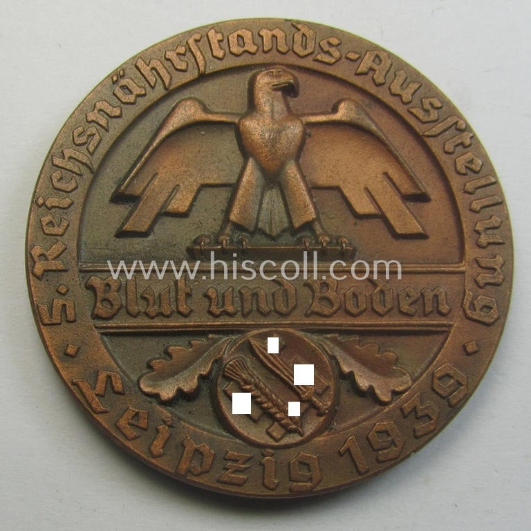 Attractive - smaller-sized- and/or typical reddish-bronze-toned - so-called: 'Reichsnährstand'- (ie. 'RNSt.'-) related, commemorative-award-plaque entitled: '5. Reichsnährstand Austellung - Leipzig 1939 - Schichtkäse'