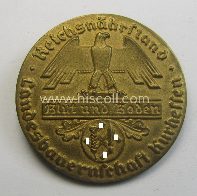 This is an attractive - and with certainty scarcely encountered! - bright-golden-toned (and I deem typical 'Buntmetall'-) based, so-called: 'Reichsnährstand des Landesbauernschaft Kurhessen'- (ie. 'RNSt.'-) related commemorative loyal-service brooch ('Brosche' ie. 'Ehrenzeichen des Landesbauernschaft Kurhessen für 40 Jahre Treue Dienste') being a non-maker-marked example showing the text that reads: 'Reichsnährstand - Blut und Boden - Landesbauernschaft Kurhessen' (and on its back the numeral '40') and that comes in an overall nice- (albeit surely issued- ie. worn-), condition. The unusually circular-shaped piece is executed in bright golden-toned (ie I deem 'Buntmetall'-based) metal: it shows some normal wear and/or moderate age but has apparently never been cleaned nor polished (it is still a tiny bit dirty but has maintained a very nice, just minimally tarnished, age-patina). The badge comes mounted onto its functional (and totally unaltered!) pin- ie. pin/catch set-up and shows some minimal age ie. staining (as can be seen on the pictures). This particular piece originates from an extensive and larger-sized 'Reichsnährstand'- (ie. 'RNSt.'-) related collection that was compiled over 40 years and that I recently acquired for the web-site. Simply a nice occasion to acquire a neat: 'Reichsnährstand des Landesbauernschaft Kurhessen'-related, so-called: 40-years-loyal-service brooch for an interesting and I deem justified price!