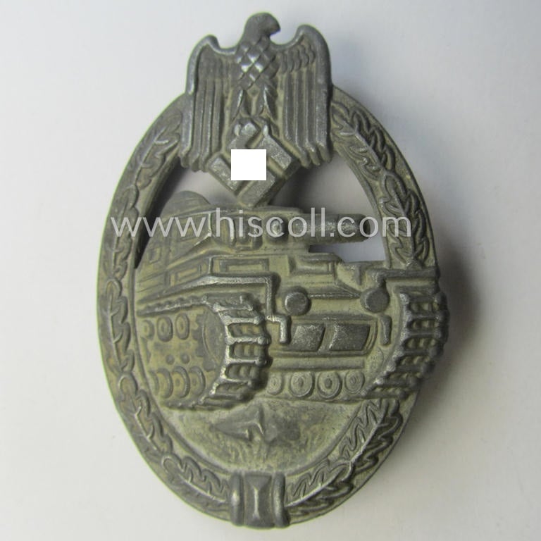 This is a neat - regrettably incomplete and I deem just moderately used and/or worn but nevertheless still nicely preserved! - so-called: 'Panzerkampfabzeichen in Silber' (or: silver-class panzer assault badge or PAB) being a detailed and/or typical zinc- (ie. 'Feinzink'-) based version as was procuced by the: 'B.H. Mayer- (ie. 'Otto Schickle'-) company and that comes in an overall nice- (albeit moderately worn- ie. most certainly issued-), condition. The badge on offer here concerns a desirable (I deem early- ie. mid-war-period-) hollow-styled, zinc-based specimen that was most certainly never cleaned nor polished: a fair bit of its silver-toned finish has been nicely preserved: it just shows some obvious age and/or tarnish. As stated above, is this piece a non-maker-marked example (as always by this specific maker) that shows various characteristics only seen with PABs as produced by the: 'B.H. Mayer'- (and presumably distributed by the) 'Otto Schickle'-company based in the town of Pforzheim. The neat piece - which is quite pronounced and has naturally great pronounced detail - naturally shows all the details as to be expected for a badge by this particular maker. It deals I deem with a so-called: 'Hollow Zinc'-based-example (as is uniquely numbered with the reference-number: '4.1.1.' according to the excellent reference-work entitled: 'The Panzer-Assault badge of WWII' by my Belgian friend Philippe de Bock). It was recently found as such at a German flea-market and was never before in collectors'-hands. Regrettably comes this example in a damaged ie. incomplete condition and misses its catch. These neat hollow-back PABs by the 'B.H. Mayer'-company are often missing in collections and can easily be graded 'scarce'. Simply a an attractive and honest, 'silver'-class PAB that is I deem priced accordingly!