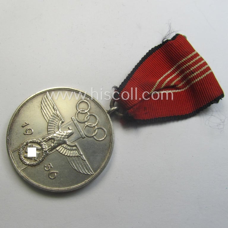 This is an attractive example of a so-called: 'Deutsche Olympia-Erinnerungsmedaille 1936' (or: Berlin Olympic Games 1936 commemorative-medal) being a non-maker-marked example (as always) that comes mounted onto its original, (truly) bright-red-coloured (and non-faded!) ribbon (ie. 'Bandabschnitt') and that comes as issued and/or stored for decades. The award is an attractive (ie. truly detailed- and pronounced!) piece that retains most (ie. all!) of its its period-applied, somewhat 'frosted' and bright-silver-coloured finish: it also retains most of its: 'hochpolierte Kanten' (or polished sides) but is a tiny bit stained (it has never been cleaned nor polished). It comes mounted onto its (bright- ie. darker-) red-coloured albeit somewhat shortened ribbon: moreover, is its period, silver-toned 'attachment-clip' also present (as can be seen on the pictures). Simply an attractive example that will be very hard to be upgraded: I deem that I have priced this attractive specimen, accordingly!