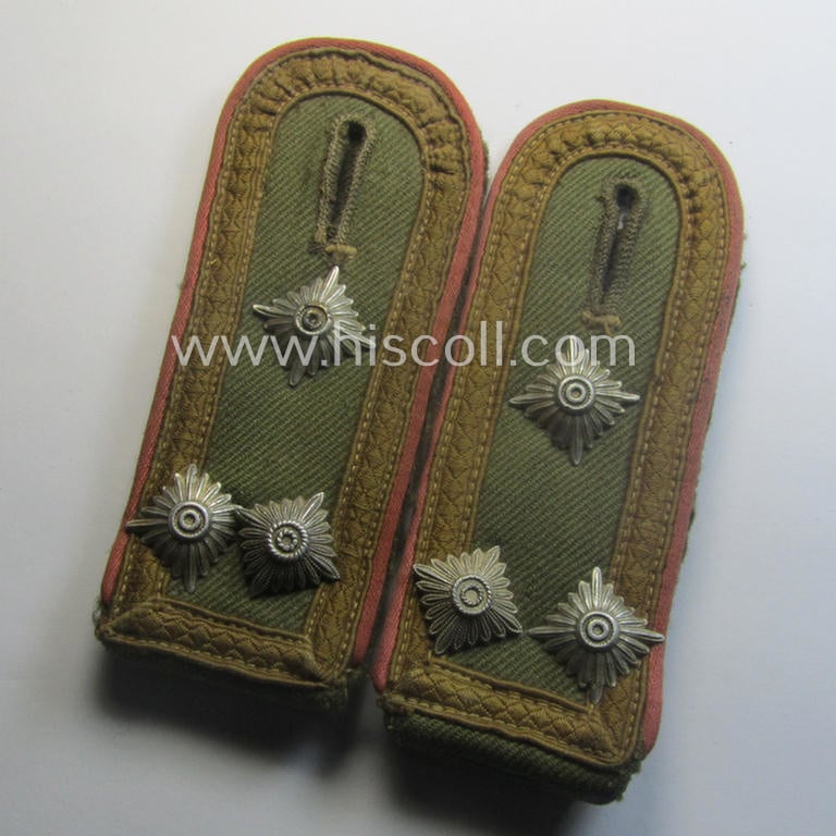 This is a truly very attractive - fully matching and most certainly exceedingly rarely encountered! - pair of (I deem mid-war-period- ie. presumably still 'DAK'- or: 'Deutsches Afrika Korps'-related-), WH (Heeres) NCO-type, 'standard-issued' and/or 'tropical'-pattern shoulderstraps as piped in the neat bright-pink- (ie. 'rosaroter'-) coloured branchcolour as was intended for - and most certainly worn by! - a: 'Stabfeldwebel der Panzer- o. Panzerjäger-Trpn.' (or: senior- ie. company-sergeant who served within the army, tank- ie. tank-destroyer-troops) and that comes in an overall very nice- (albeit moderately used ie. clearly worn- and/or tunic-removed-), condition. The neat shoulderstraps - which are as stated above totally matching in execution and/or style - measure approximately 11,2 cms. in length each. Both straps have the typical brownish-green- (ie. tropical-) coloured and/or linnen-based 'upperdecks' (and brownish- ie. earthen-green-coloured, woolen-based 'backings' as is more often seen) and have the neat - and desirable! - bright-pink- (ie. 'rosaroter'-) coloured branchcolour and/or desirable 'silk-like'-type piping, attached. The pair shows the golden-brown-coloured (ie. typical tropical 'sub-dued') NCO-braid and six (regular-sized, not complete matching and/or zinc- ie. partly aluminium-based) pips period-attached denoting the (unusually seen!) rank of: 'Stabsfeldwebel' (ie. senior NCO ie. company-sergeant). The pair comes naturally mounted onto its functional tongues and comes as most certainly worn and/or stored as such for decades. The neat pair was always together and was most certainly worn as such. The set is just a tiny bit dirty ie. stained and shows the clear evidence of having been moderately used and/or worn (it has minimally been faded due to obvious sunlight and does show some minimal staining). It should be noted that all (genuine!) tropical- ie. 'DAK'-related NCO-shoulderstraps are very hard to encounter and can easily be graded 'very rare': most of the pairs offered on todays' market are regrettably copies. This truly superb pair originated from an extensive and older shoulderstrap- ie. board-collection that I recently acquired for the web-site. I am aware of the fact that they are highly priced something that is - I deem - according to their unmistaken rarity and/or desirability!