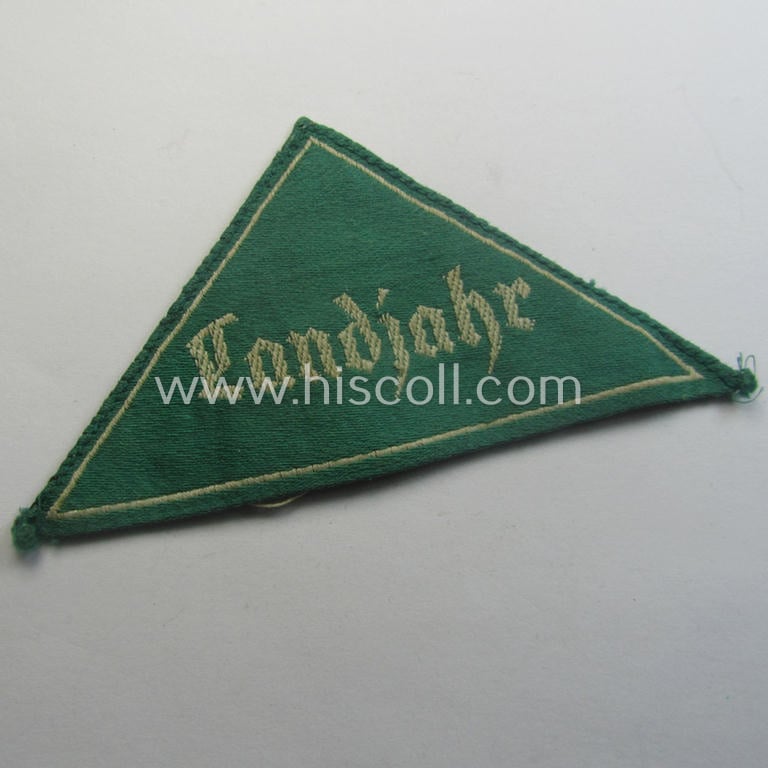 This is an attractive - and actually fairly scarcely encountered! - HJ (ie. 'Hitlerjugend') light-green coloured and/or typical linnen-based so-called: honorary-district-triangle (ie. 'Gebietsdreieck') entitled: 'Landjahr' that comes in an overall very nice- (albeit I deem just minimally used ie. worn- and/or I deem tunic-removed-), condition. The triangle - which has been just minimally used - shows some normal age, wear and/or staining. It still retains its so-called: 'RzM'-etiket in place (as can be seen on the pictures). The purpose of this 'HJ-Landjahr'-movement, which was introduced in 1934, was to 'deepen the ties connecting the young people of urban areas with the land and peasentry'. The 'Gebietsdreieck' is void of any damage or alike and just shows some minimal age, wear and/or staining (as can be seen on the pictures). Simply a very attractive - and actually fairly scarcely encountered! - HJ-related 'Gebietsdreieck': hard to find a nicer example for a more interesting price!