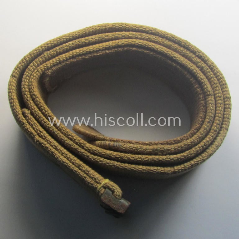 This is an attractive - and I deem only minimally or even never used - example of a WH (Heeres ie. Luftwaffe etc.) 'tropical-issued'- and/or entirely 'web-based' belt (ie. 'Koppelriemen') as was executed in yellowish-tan-coloured and/or neatly woven linnen (ie. 'webbing') and having a linnen-based tongue, being a neat example that is approximately 95 cms. sized and that comes in an overall very nice- (ie. most certainly issued- albeit minimally used- ie. worn-), condition. The belt shows a stamped makers'-designation that reads: 'Kurt Seidel - Berlin W 36' and is also dated: '1943' (as can be seen on the pictures) and does show a blue inked size-stamp under the tongue (that reads: '95') as can be seen on the pictures. The belts'-tongue is as stated fabricated in typical, yellowish-coloured linnen (as can be seen on the pictures). The piece was just moderately used and its overall condition is still very nice and of course fully functional. The metal-based catch retains most of its greenish- ie. typical field-grey-coloured finish (that shows some minimal rust-staining). It should, however, be mentioned that the piece is a few cms. shorter than the stamped 95 cms. (it measures actually approx. 92 cms.) Hard to find a more nicely preserved and/or attractive example for a more interesting price: the belt just needs an equally nicely preserved 'Heeres' ie. 'Luftwaffe'-type belt-buckle to complete it. I deem that this nicely preserved example is accordingly priced!