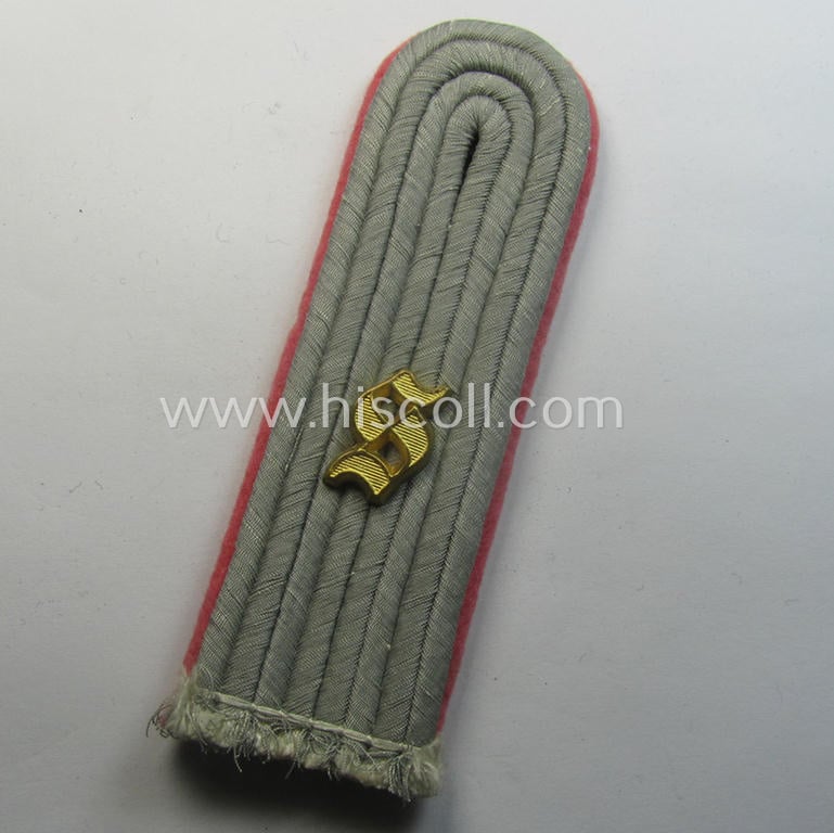 This is an attractive - albeit regrettably single! - neatly 'cyphered', officers'-type shoulderboard having the (bright!) pink-coloured branchcolour as was intended for usage by a: 'Leutnant eines Panzerschützen-Regiments' (or: lieutnant who served within a specific tank- ie. tank-gunners regiment) and that comes in an overall very nice- (albeit I deem hardly used nor worn- and/or I deem never tunic-attached-), condition. The shoulderboard which is approximately 11,2 cms. sized in length and that is piped in the neat bright-pink- (ie. 'rosaroter'-) coloured branchcolour as to be expected shows a neat (bright golden-coloured, 'Buntmetall'-based, Gothic-styled- and/or: larger-sized) so-called: 'S'-cypher (ie. 'Ziffer') period-attached denoting that the strap was intended for a junior-officer who held the rank of a: 'Leutnant' (ie. lieutnant). The device shows some regular age and/or minimal tarnish but is still very nicely preserved. The strap never had a tongue attached (it is a specimen of the 'sew-in'-type) and does show some minimal age and/or staining (as can be seen on the pictures). The piece was never before in collectors'-hands and was recently found as such. Simply an attractive 'Heeres', officers'-type shoulderstrap that belonged to a: 'Leutnant eines Panzerschützen-Regiments': too bad that it is only a single specimen!