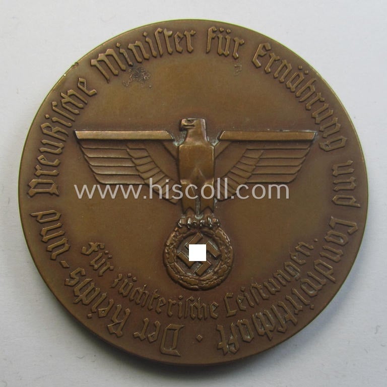 This is a truly attractive and very pronounced - and with certainty scarcely encountered! - darkened bronze-toned (and I deem typical 'Buntmetall'- ie. genuine bronze!) based, so-called: 'Reichsnährstand'- (ie. 'RNSt.'-) related, honorary-plaque (ie. 'Erinnerungs- o. nichttragbare Plakette') showing a detailed Reichsadler-device surrounded by the text: 'Der Reichsminister für Ernährung und Landwirtschaft - Für Süchterliche Leistungen' and showing on its back the superimposed (and very detailed!) illustration of a horses-head and that comes in an overall very nice- (albeit surely issued-), condition. The unusually circular-shaped honorary-plaque (having an approximate diameter of 5 cms.) is executed in (minimally tarnished) bronze-toned (ie. I deem 'Buntmetall'-based ie. genuine bronze-based) metal: it shows some normal age but has apparently never been cleaned nor polished (it is still a tiny bit dirty but has maintained a very nice, just minimally tarnished, age-patina). This particular piece originates from an extensive and larger-sized 'Reichsnährstand'- (ie. 'RNSt.'-) related collection that was compiled over 40 years and that I recently acquired for the web-site. Of additional interest is, moreover, the fact that this example shows a superimposed name of the famous artist (ie. designer) named: 'Albert Hinrich Hüssmann' (as can be noticed on the pictures). Albert Hinrich Hussmann (1874–1946) was a German artist and sculptor specializing in horse and rider statues. Hussmann was born on 3 March 1874 in Cuxhaven, Germany. He studied at the Academy of Fine Arts in Berlin. His statues were featured several times in the Great Berlin Art Exhibition. Hussmann designed pieces for the Bavarian porcelain company Rosenthal from 1909 through 1943 and died on 15 November 1946 in Lüdingworth, Germany.Simply a nice occasion to acquire a neat: 'Reichsnährstand'- (ie. 'RNSt.'-) related honorary-plaque (ie. 'Erinnerungs- o. nichttragbare Plakette') for an interesting and I deem justified price!